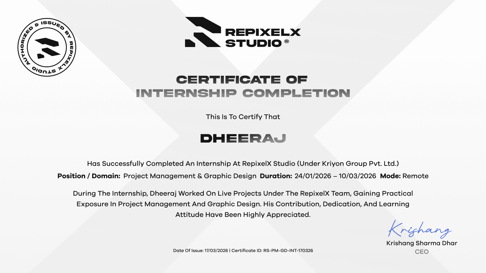 RepixelX Studio provided me the opportunity to grow creatively through practical video editing and graphic design projects. Grateful for the mentorship and support throughout the journey.